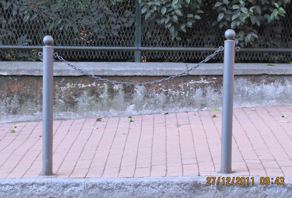 Dissuasore stradale costituito da un colonnino cilindrico leggermente rastremato con anelli semicircolari per l'attacco della catena e da un pomello sferico alla sommità. Base circolare con anelli decoraivi copriscasso e apposita zoccolatura per l'ancoraggio fisso in fondazione Verniciatura a polvere grigia possibilita’ di collegamento tramite catena. ALTEZZZA